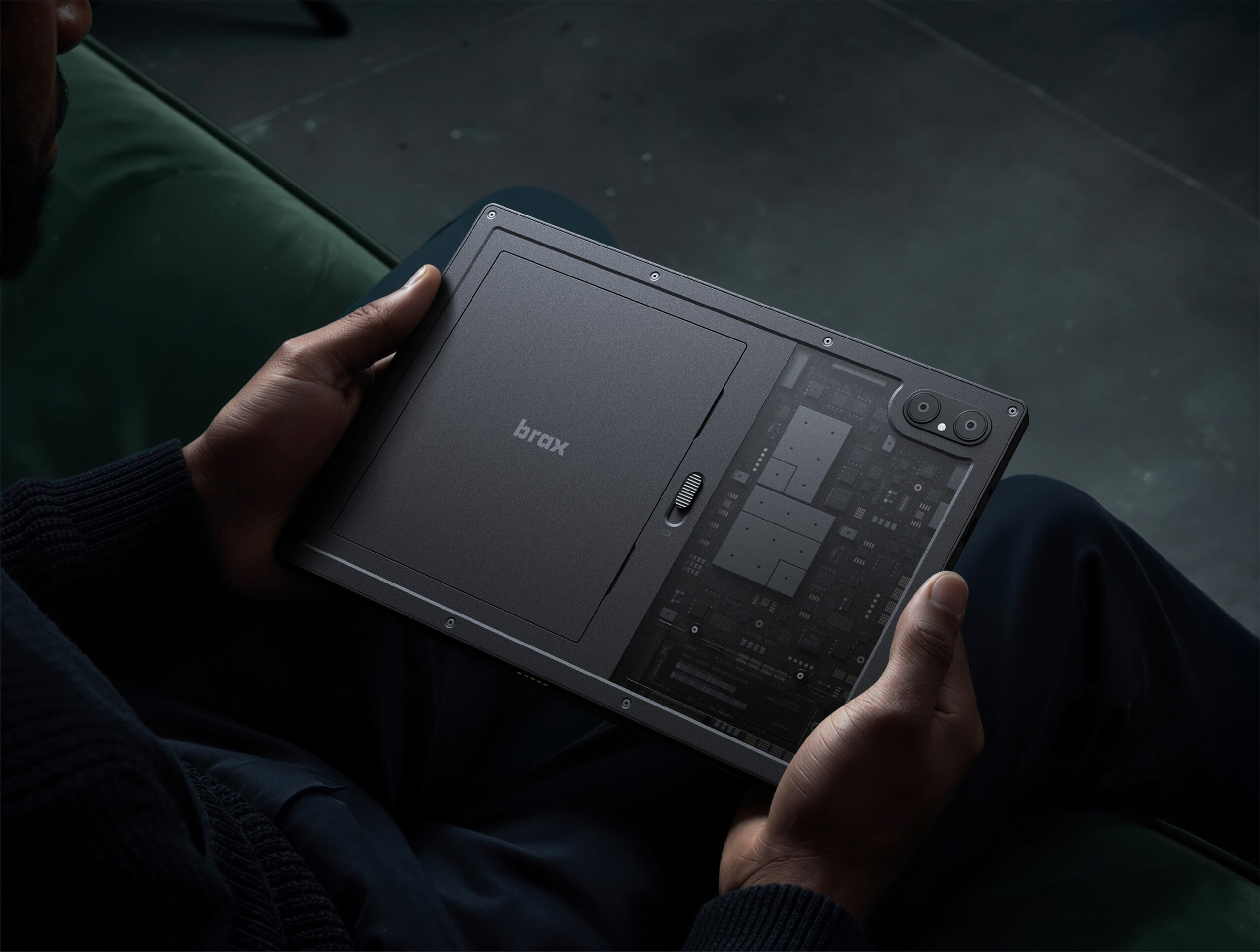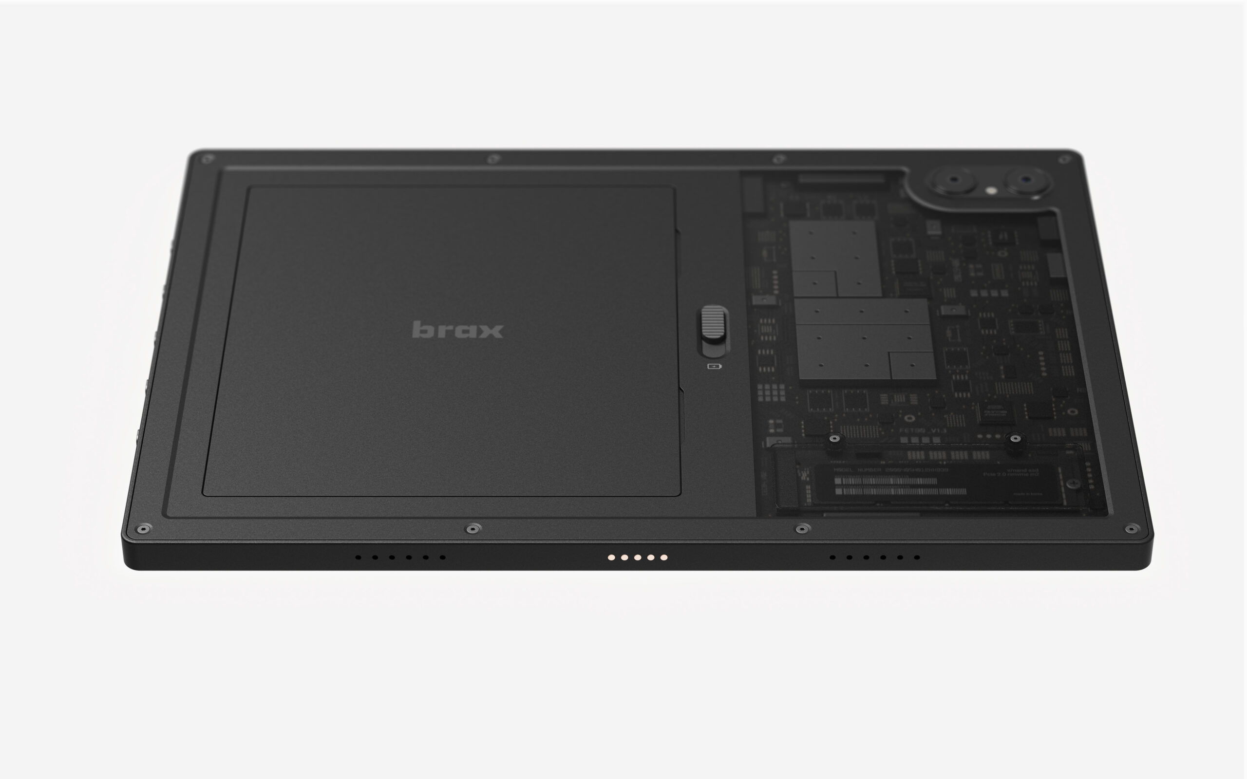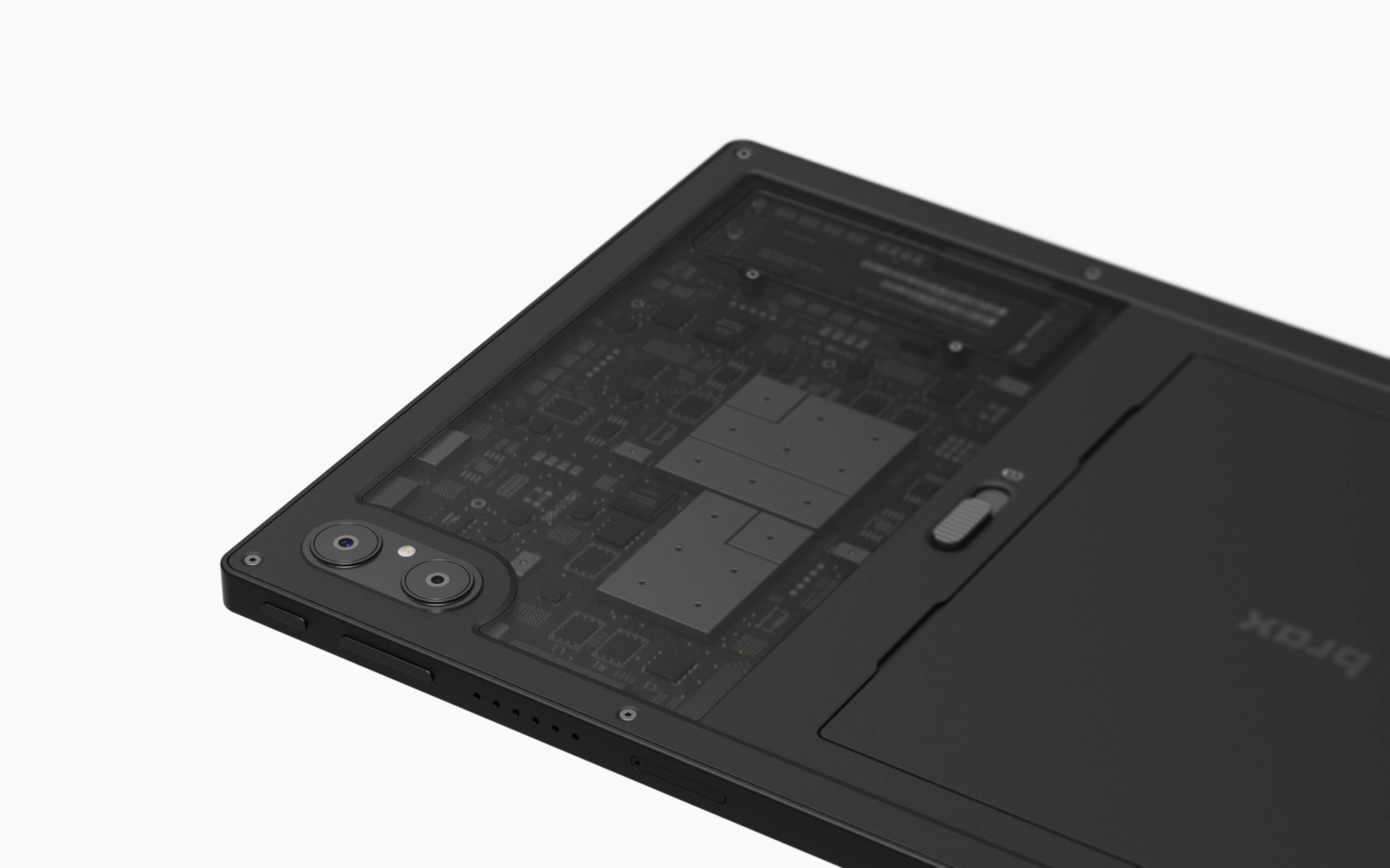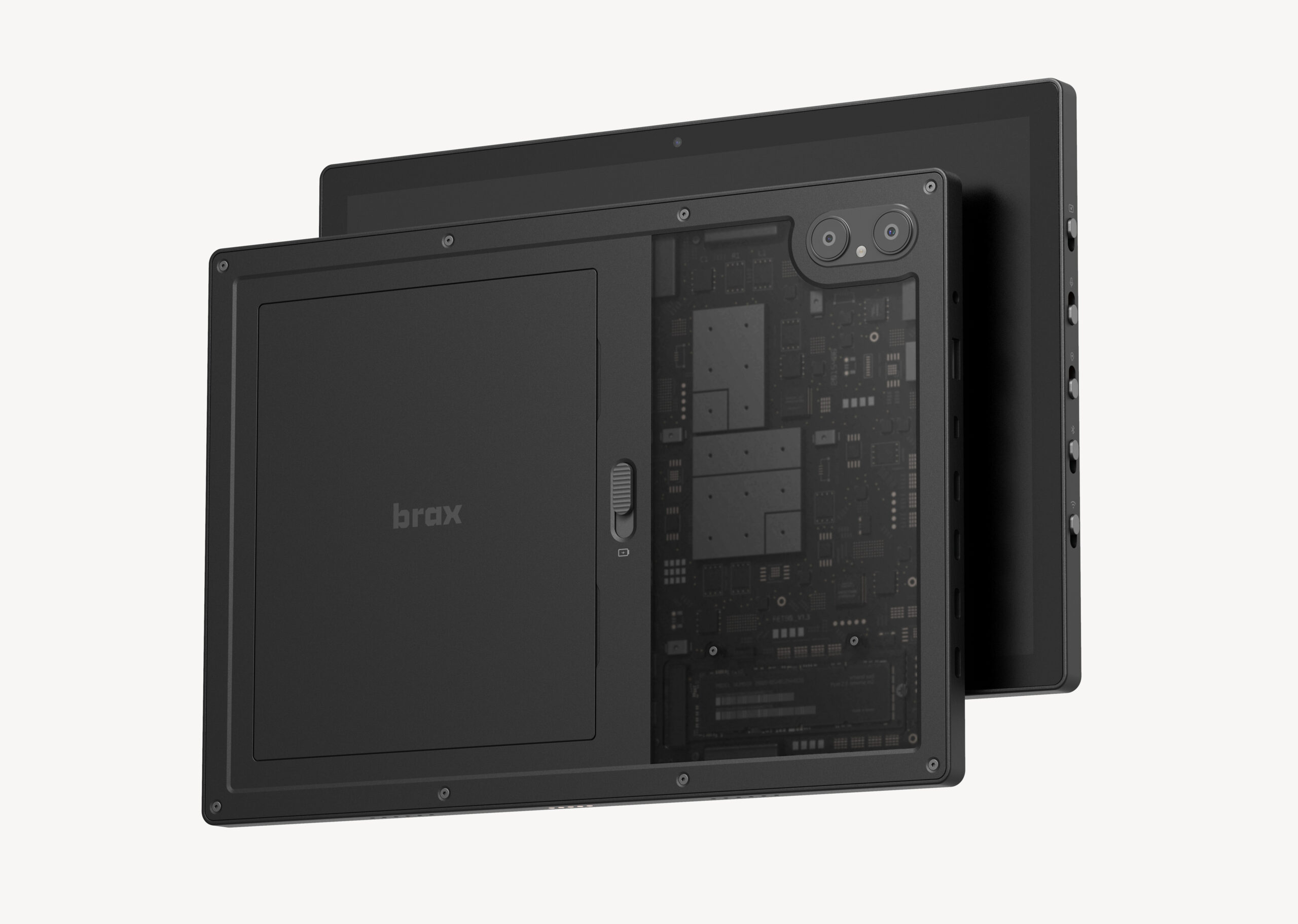 Following the design language introduced by Brax3 phone, Open-slate features a window in the back made of dark tinted acrylic. Transparency is used both to reinforce the open and transparent communication style of Brax Technologies and as an aesthetic feature to show off the technology inside.