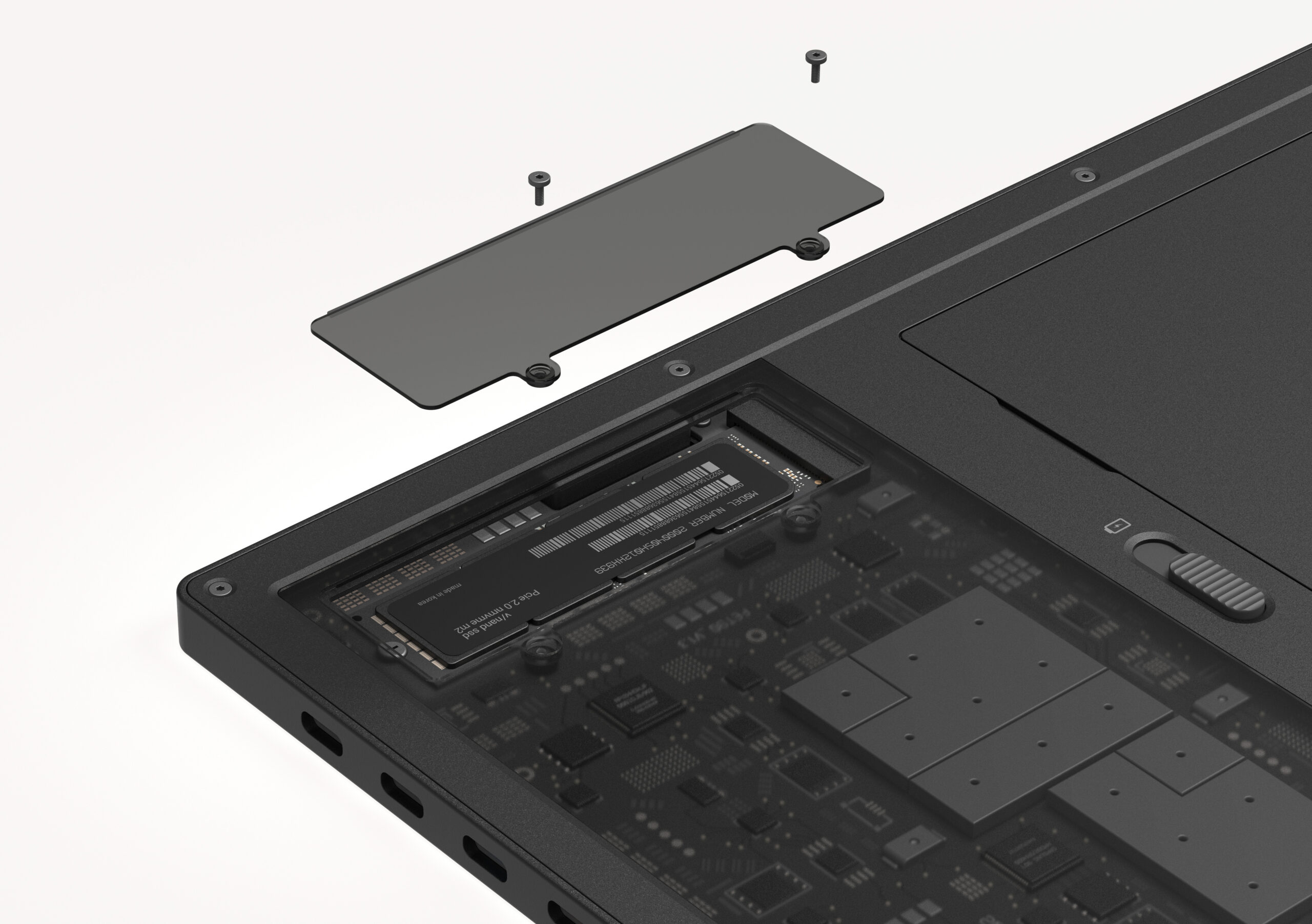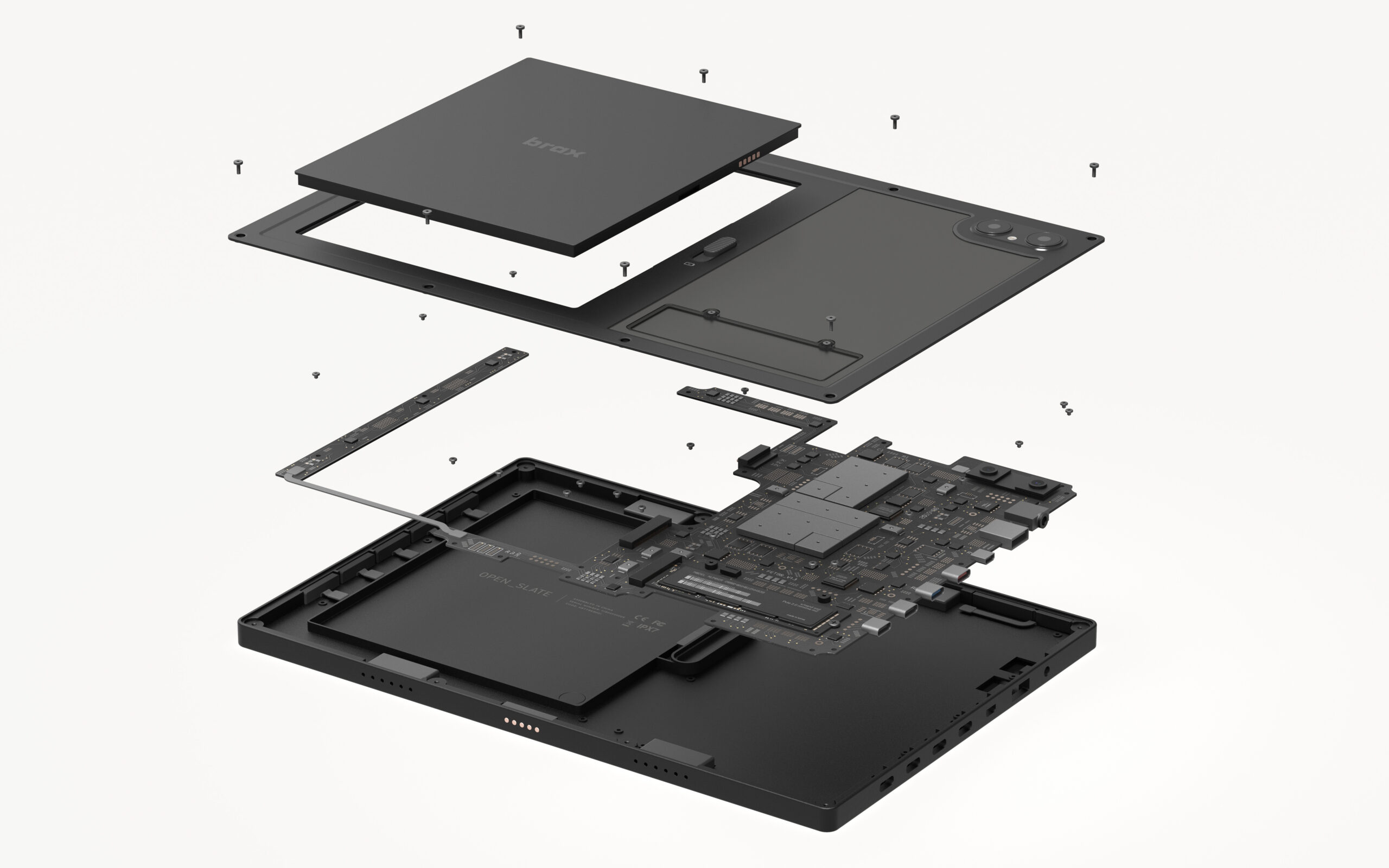 MODULAR DESIGN. Open-slate was designed with the end users in mind: people that want performance, control and privacy. It features a modular design that is easy to customize, service and repair. The back panel can be opened through 6 non-proprietary screws, the battery can be quickly removed and swapped by sliding the dedicated button and the M2 PCIE memory can be easily customized.