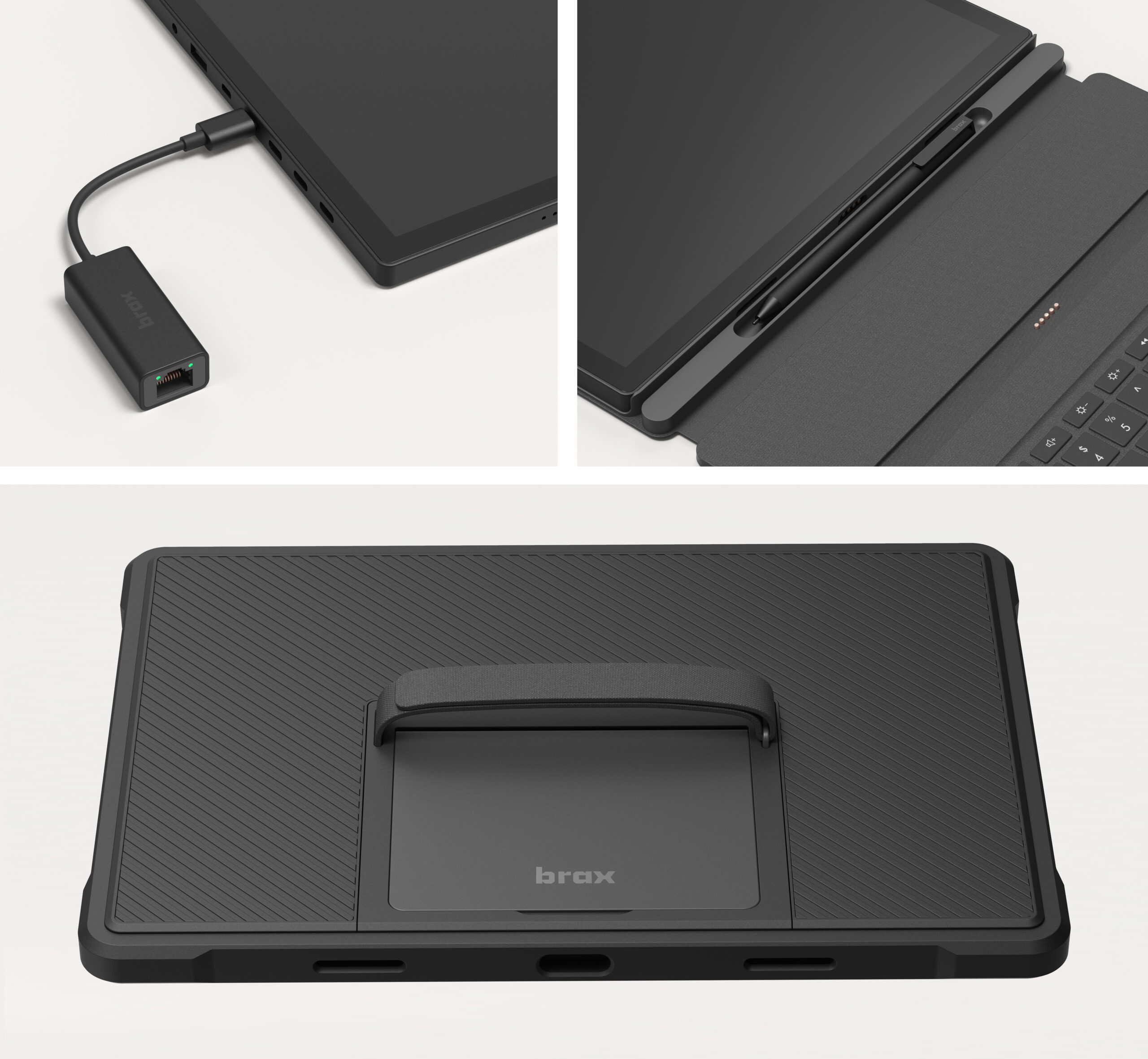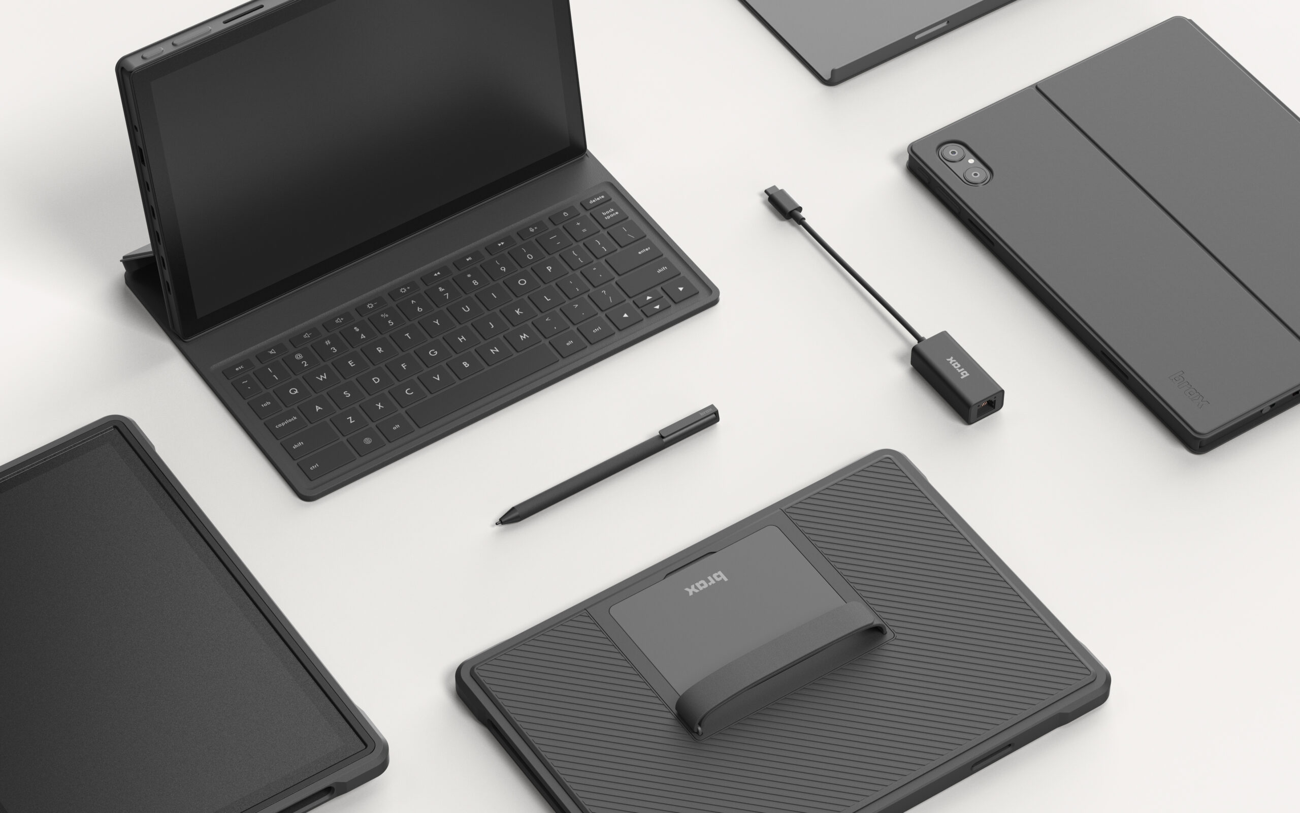 Open_slate product offering is complemented by a variety of accessories that include a rugged case, a keyboard folio case, a simple folio case, an active stylus, and an ethernet adapter. All accessories have been designed coherently, with a bold, professional and slightly techy look.